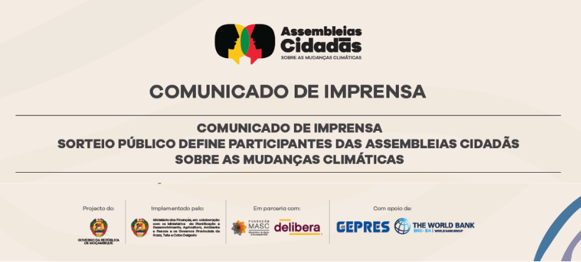 Após a mobilização comunitária nas províncias de Cabo Delgado e Tete, que permitiu o registo de 600 cidadãos adultos, com 18 ou mais anos de idade, em cada província, o Governo da República de Moçambique prepara-se para realizar uma das etapas decisivas das Assembleias Cidadãs sobre as Mudanças Climáticas, nomeadamente o “sorteio público” dos participantes, que irão deliberar sobre o uso das receitas provenientes da exploração de recursos naturais para reforçar a resiliência climática das comunidades.